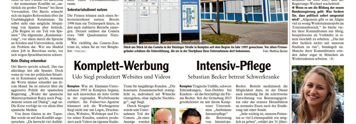 Um in der Ausgabe der Allgäuer Zeitung vom 17.10.2017, Seite 33 die Firmenvielfalt des Unternehmerkomplexes Cometa zu demonstrieren wurden 4 Firmen ausgewählt einen kleinen Einblick in die Firmengeschichte zu gewähren, über Ihr Tätigkeitsfeld zu sprechen und wie Sie auf das Cometa aufmerksam wurden.