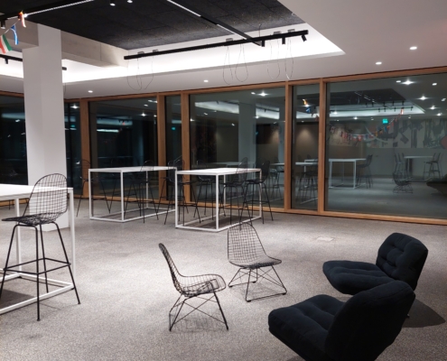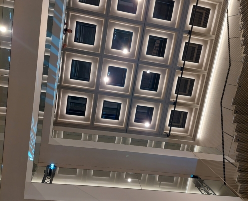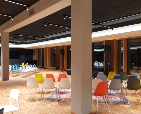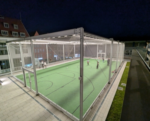 Im Mensabereich des Schulgebäudes öffnet sich ein beindruckendes Atrium, das für eine  helle und einladende Atmosphäre sorgt.